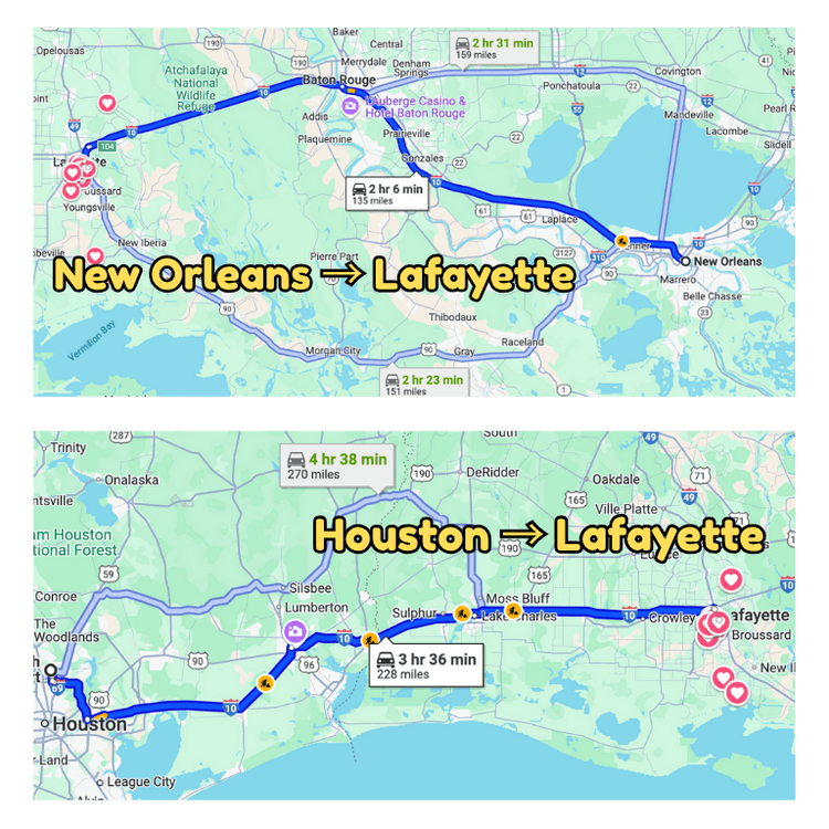 Alternatively, if you want to make a road trip out it, Lafayette is just a 2-hour drive from New Orleans or about 3.5 hours from Houston — both great points for exploring Cajun Country.